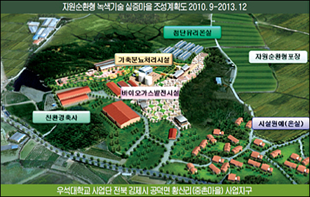 ‘자원순환형 녹색마을’ 실증사업를 통해 농촌진흥청은 마을 축산농가에서 나오는 가축분뇨를 자원으로 이용해 전기, 열, 비료를 생산하고, 이를 마을과 농경지에 환원함으로써 에너지 자립은 물론 친환경 축산-자원순환농업을 구현하겠다는 게 목표다.