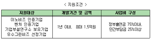 지원규모는 25억원으로 20개 내외의 중소기업을 지원하며, 지원금액은 개발기간 1년 이내에서 1.5억원 한도로 기술개발이 가능한 과제를 자유응모 형태로 공모하여 지원한다.