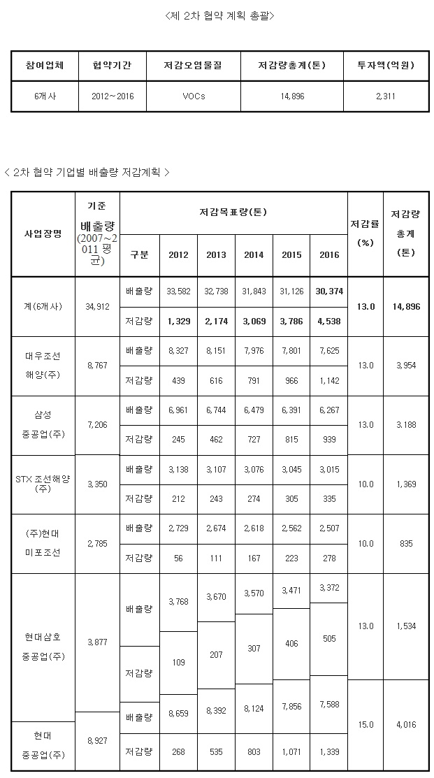 ◇ 대형 조선업체 6개사, 1차 협약(2007~2011)에 이어 2012~2016년에도 휘발성 유기화합물질(VOCs) 총 14,896톤까지 지속적 저감키로 관계당국과 자발적 협약체결
